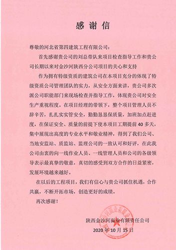 業(yè)主單位陜西金沙河面業(yè)有限責任公司在感謝信中,對公司管理團隊的專(zhuān)業(yè)水平和綜合實(shí)力給予了充分肯定,表達了今后與公司深化合作的意愿。來(lái)自不同單位的錦旗上,分別寫(xiě)著(zhù)“服務(wù)至上 誠信履約”“創(chuàng )精品工程 展鐵軍風(fēng)采”“技術(shù)創(chuàng )新 高質(zhì)高量”,充分體現了對公司管理團隊誠信守責、真抓實(shí)干、技術(shù)過(guò)硬、能打勝仗工作作風(fēng)的一致肯定。
