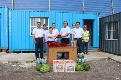 上午8點(diǎn),公司滿(mǎn)載茶葉、西瓜、蘋(píng)果、花露水等慰問(wèn)品的商務(wù)車(chē)緩緩開(kāi)進(jìn)職工生活區,李懷生一邊給職工發(fā)放慰問(wèn)品一邊關(guān)心地詢(xún)問(wèn)他們的生活和工作情況,并叮囑他們有困難和問(wèn)題及時(shí)向項目部反映,還要求項目部一定要做好職工的后勤保障,讓大家消除后顧之憂(yōu)。