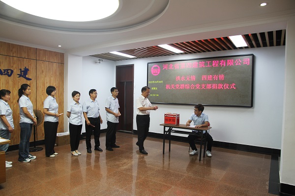 洪水無(wú)情,四建有愛(ài)。公司發(fā)揚“一方有難,八方支援”的中華民族優(yōu)良傳統,9月7日—14日,僅一周時(shí)間,全體職工匯聚愛(ài)心捐助款項共計111723元,通過(guò)集團公司賬戶(hù)捐獻給易縣人民,用于易縣抗洪救災和災區人民重建家園。