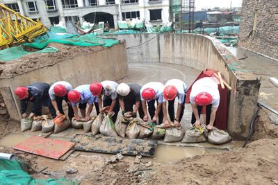 防汛演練緊貼實(shí)際。首先項目部按照預定方案和針對現場(chǎng)地形,最容易產(chǎn)生積水的車(chē)庫成為了此次防汛的重點(diǎn)搶險位置。在演練過(guò)程中于立功以身作則,沖在防汛最前面,帶領(lǐng)工人扛沙袋,設置警戒線(xiàn),在車(chē)庫入口做好擋水墻;現場(chǎng)臨電電工接通電線(xiàn),啟動(dòng)移動(dòng)水泵等搶險設備抽排積水;清淤小組打開(kāi)雨水篦進(jìn)行人工助排,快速清理路面淤泥垃圾等,搶險現場(chǎng)各項工作井然有序進(jìn)行。演練過(guò)程中全體人員士氣高昂、配合默契、銜接流暢,圓滿(mǎn)地完成了防汛應急演練。
