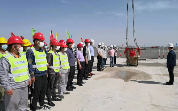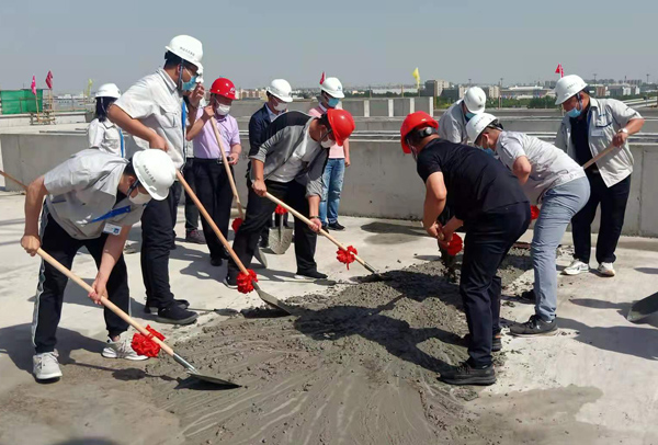 隨著(zhù)建設方代表韋漢英總經(jīng)理發(fā)出“封頂儀式啟動(dòng)”的指令,塔吊啟動(dòng)、泵車(chē)轟鳴,正天車(chē)間大樓封頂儀式正式開(kāi)始,扎著(zhù)紅色彩球的混凝土泵送車(chē)揮動(dòng)大臂從地面將混凝土泵送至樓上30米高處的布料斗,塔吊臂跑車(chē)滑動(dòng),承載著(zhù)繡帶飄揚的料斗平穩的將混凝土運送至澆筑點(diǎn),三方人員拿起鐵鍬,揮臂鏟砼,完成了最后一立方混凝土的澆筑,共同見(jiàn)證了大樓主體的圓滿(mǎn)封頂。