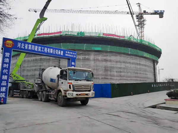 熟料儲存及輸送筒倉直徑60米,高20.5米。1月11日,業(yè)主項目負責人王利杰組織召開(kāi)專(zhuān)題會(huì )議,鄭重要求1月20日前滑模施工必須完成。面對業(yè)主早日投產(chǎn)的殷切期盼,項目部緊急組織施工策劃,明確搶進(jìn)度措施辦法,全體動(dòng)員,多點(diǎn)發(fā)力,全力以赴?;J┕?。在動(dòng)員會(huì )上,成立了以項目經(jīng)理為組長(cháng)的滑模領(lǐng)導小組,班子帶班,明確責任目標;與作業(yè)班組簽訂安全、質(zhì)量承諾書(shū),增強其責任意識;購置鋼筋間距測量設備,節省驗收鋼筋工程時(shí)間和人力。由于疫情原因,現場(chǎng)勞力不能迅速到位,項目部提前組織管理人員晚上加班吊運鋼筋、水泥、腳手板等材料,大家高漲的干勁兒在滑?,F場(chǎng)起到了積極的帶動(dòng)作用。庫壁預應力鋼絞線(xiàn)設置較為密集,每間隔26厘米一道,而且帶有柔性,往庫壁鋼筋內穿設時(shí)容易跑偏,工作效率低。為加快施工,技術(shù)人員巧妙地在庫壁鋼筋上加設了U型鋼筋固定鋼絞線(xiàn)穿行位置,然后大家一字排開(kāi),“一二、一二……”齊聲喊著(zhù)口號,有節奏地用力將鋼絞線(xiàn)在庫壁鋼筋里穿行直到扶壁柱。數九隆冬的夜間滑模平臺上氣溫很低,但是大家的工作熱情不減,干勁不退,抬鋼筋、綁鋼筋、穿鋼絞線(xiàn)……,干得熱火朝天,沒(méi)有人叫苦喊累,在大家的共同努力下,滑模以每天2.7米的速度快速推進(jìn)。